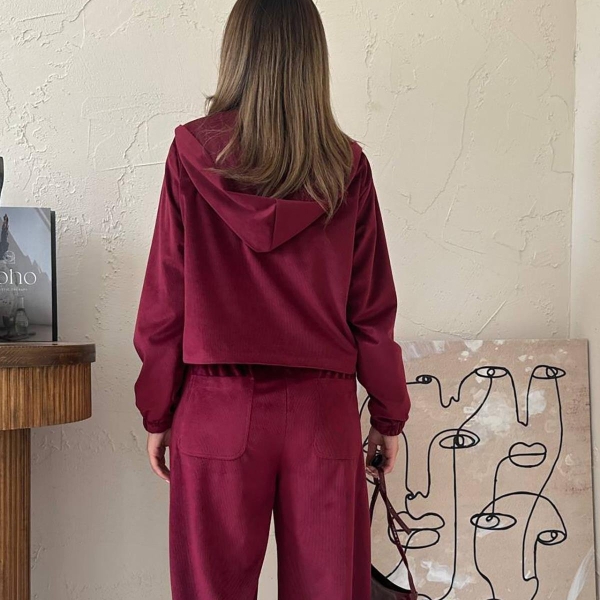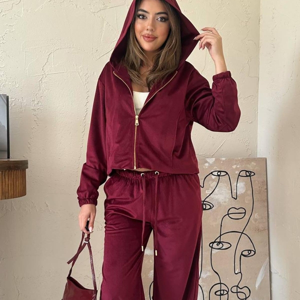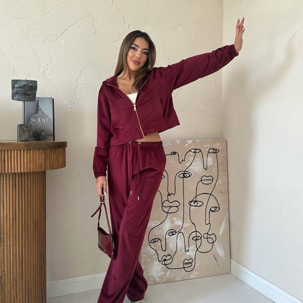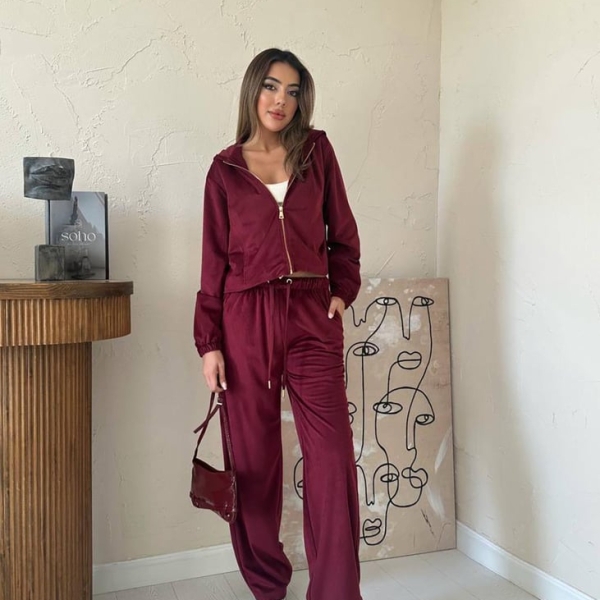 Elevate your casual wear with this chic burgundy velour (fine velvet) tracksuit set. Featuring a zipped hoodie jacket and wide-leg trousers, this ensemble perfectly blends comfort and style. The rich, versatile color offers a modern and trendy aesthetic, ideal for athleisure or relaxed everyday outfits. The soft, stretchy fabric ensures ease of movement and a luxurious feel. A perfect elegant casual suit for women looking for quality and an effortless, fashionable look.