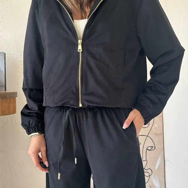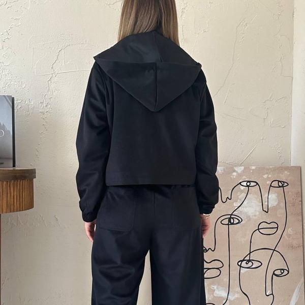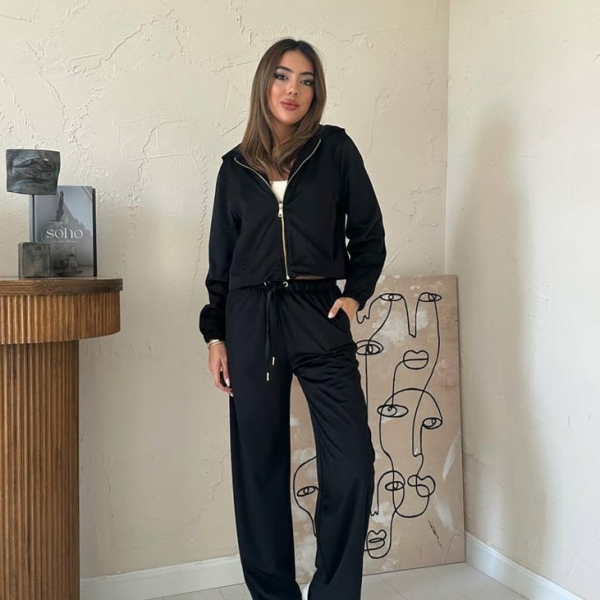 Elevate your casual wear with this chic black velour (fine velvet) tracksuit set. Featuring a zipped hoodie jacket and wide-leg trousers, this ensemble perfectly blends comfort and style. The rich, versatile color offers a modern and trendy aesthetic, ideal for athleisure or relaxed everyday outfits. The soft, stretchy fabric ensures ease of movement and a luxurious feel. A perfect elegant casual suit for women looking for quality and an effortless, fashionable look.
