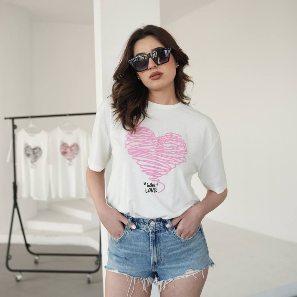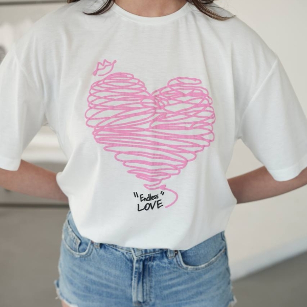 Стильная женская футболка с оригинальным принтом — розовое сердце в виде художественного контура и надписью «Ladies Love». Идеально подходит для повседневных образов, прогулок и вечеринок. Универсальный фасон и мягкий материал делают её удобной на каждый день.