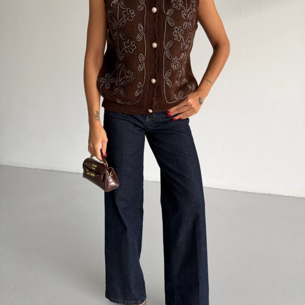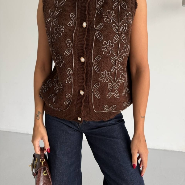 Вязаный жилет в тёплом оттенке, украшенный контрастной цветочной вышивкой и декоративными пуговицами с эффектом жемчуга. Модель без рукавов идеально подходит для многослойных образов и легко вписывается в повседневный, smart-casual или винтажный стиль. Свободный крой обеспечивает комфорт, а вышитые детали придают образу женственность и элегантность. Отлично сочетается с джинсами, классическими брюками или юбками.