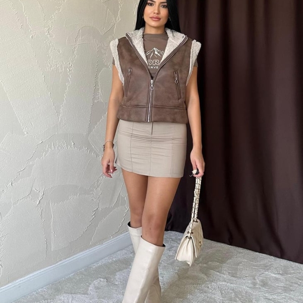 This sleeveless cropped vest features a faux suede finish with cozy shearling-style lining and hood. Designed with a double front zipper and side zip pockets, it’s perfect for layering in autumn or early spring. Its relaxed fit pairs well with dresses, jeans, or leggings for effortless urban looks.