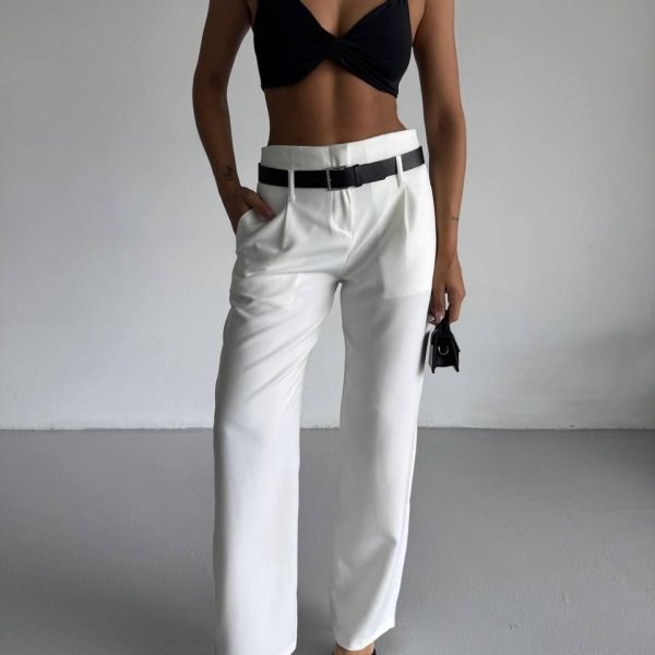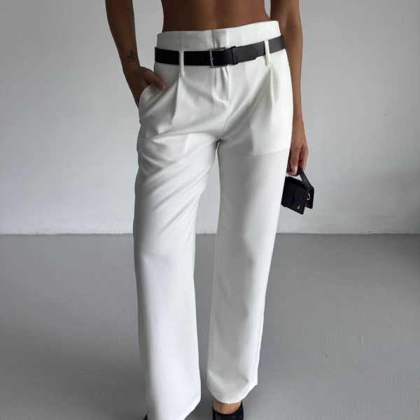 Элегантные брюки прямого кроя в белом цвете с завышенной талией. Идеальны для офисных и повседневных образов. Лёгкий эластичный материал обеспечивает комфорт в течение дня. Застёжка на молнию и пуговицу, имеются боковые карманы. Отлично сочетаются как с каблуками, так и с кедами.