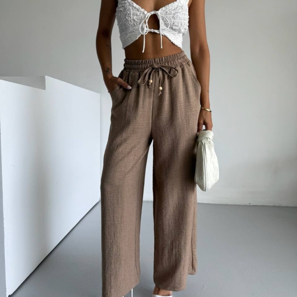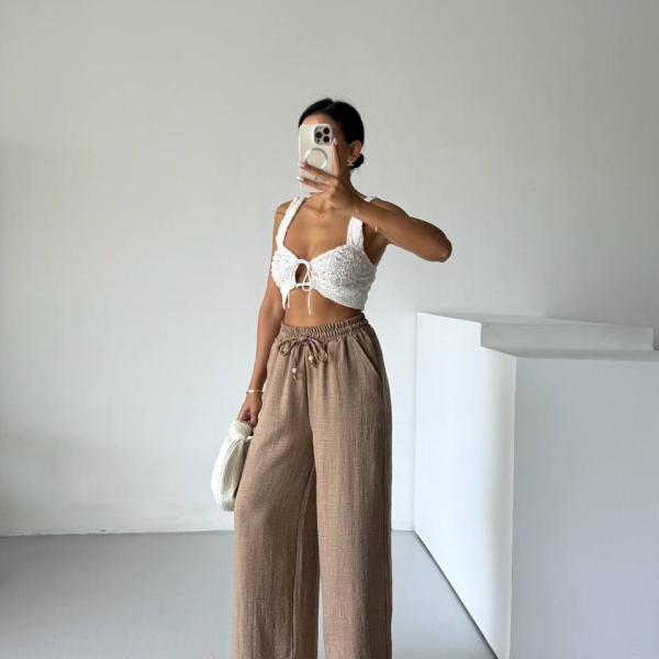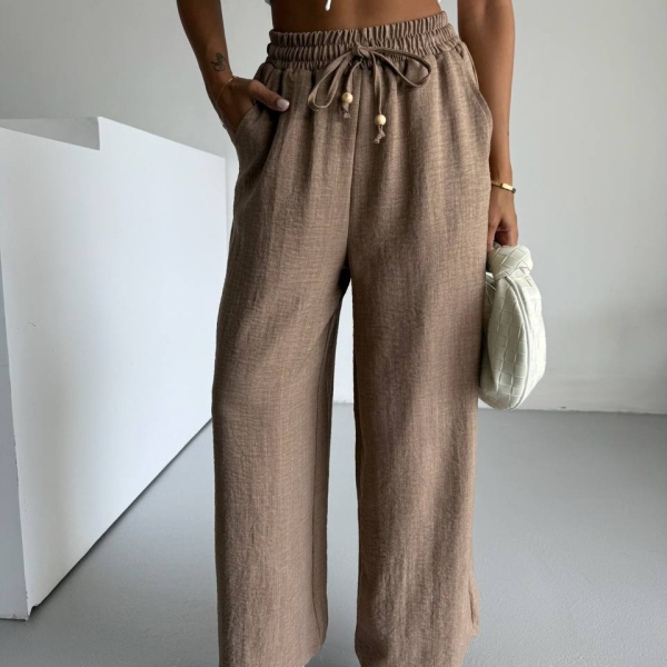 Свободные и комфортные брюки с резинкой на талии и декоративным шнурком. Изготовлены из 100% льна — идеальный выбор для жарких дней. Модель с боковыми карманами и удлинённым кроем визуально стройнит фигуру. Подходят как для прогулок, так и для повседневного стиля.