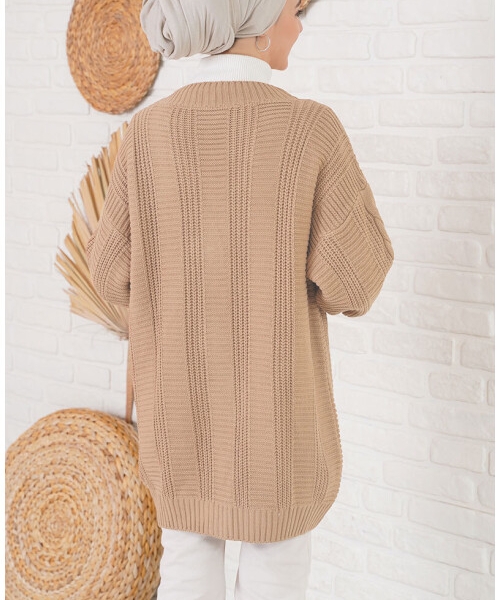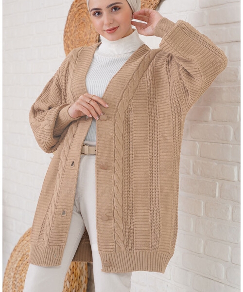 Cardigan lung și gros, de o nuanță de bej camel, cu torsade decorative și nasturi în față. Perfect pentru zilele răcoroase, oferă un aspect cozy și elegant în același timp. Potrivit pentru layering în ținutele casual de toamnă-iarnă.