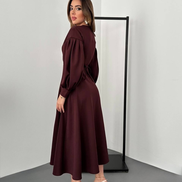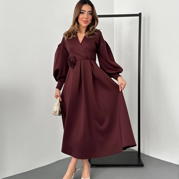 Элегантное миди-платье в А-силуэте с объемными рукавами и перекрещенным V-образным вырезом. Акцент в виде декоративного цветка на талии придаёт образу изысканность. Идеально подходит для торжеств, вечеринок и особых случаев. Плотная ткань отлично держит форму юбки.