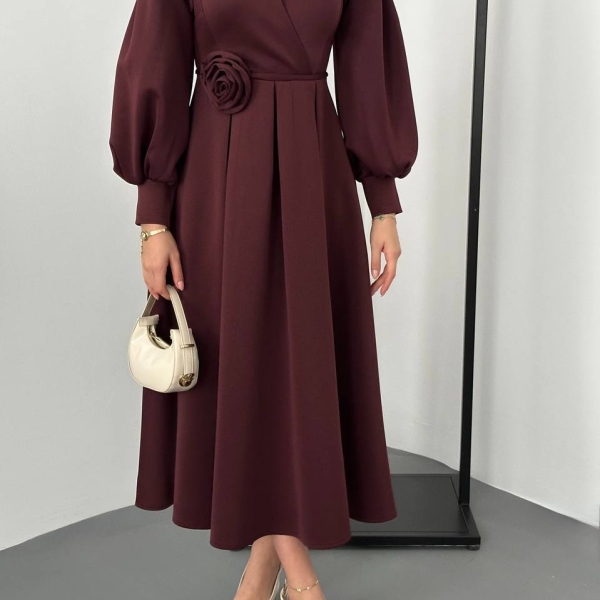 impresii despre Бордовое миди-платье с пышными рукавами и цветком