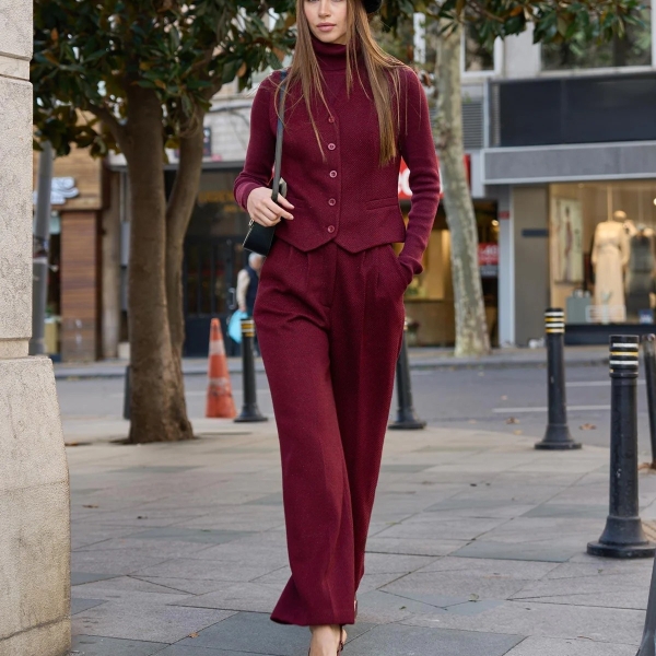 Setul vișiniu format din pantaloni palazzo și vestă cu nasturi este alegerea ideală pentru un look modern și confortabil. Croiala lejeră oferă libertate de mișcare, iar tricotajul moale asigură un plus de eleganță și căldură. Potrivit pentru ținute de zi, birou sau ieșiri casual în sezonul rece.