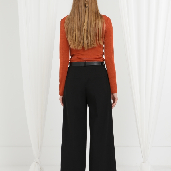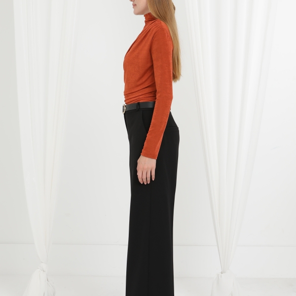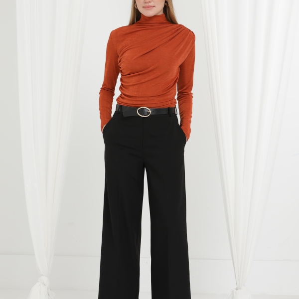 Bluză cărămizie cu drapaj decorativ și guler înalt
