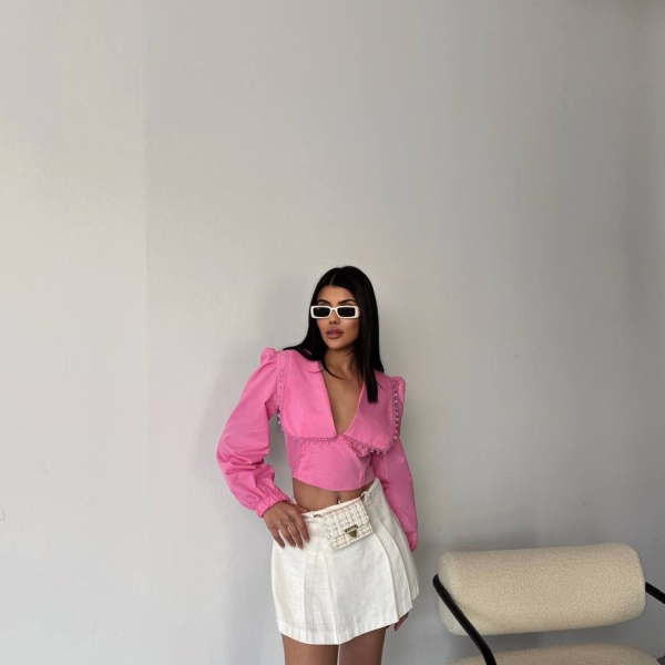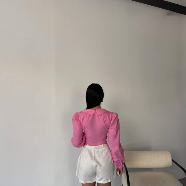 Bluză crop roz cu guler decorativ și mâneci bufante