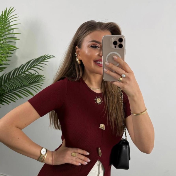Бордовая блузка с короткими рукавами и приталенным кроем подчёркивает женственный силуэт. Декоративные металлические элементы и разрез спереди придают современный стиль и элегантность. Отличный выбор для офиса или повседневных образов.