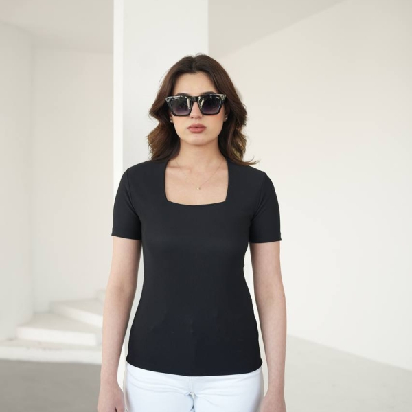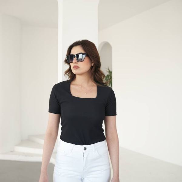 Bluză neagr[ feminină, cu decolteu pătrat și croială mulată, ideală pentru ținute casual sau elegante. Realizată din material elastic și confortabil, această bluză pune în valoare silueta și este ușor de asortat cu pantaloni sau fuste.