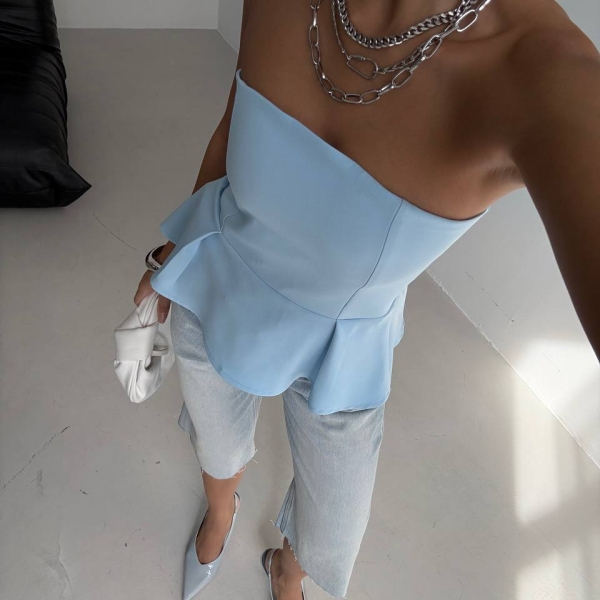 A chic strapless bustier top with a delicate peplum at the waist. Ideal for summer outings or casual-chic occasions. The soft stretch fabric hugs the body comfortably, enhancing your silhouette. Pairs well with high-waisted shorts, jeans, or skirts.