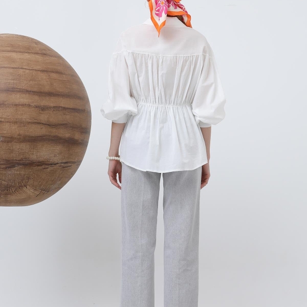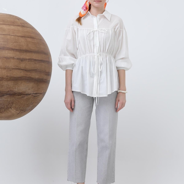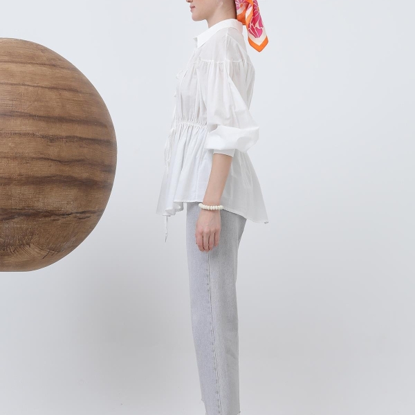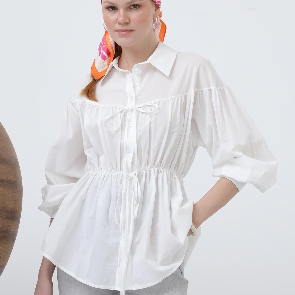 White 100% cotton women’s shirt with a relaxed fit and delicate ruched details that define the waistline. Features a front button closure and an adjustable tie, making it perfect for casual, office or smart casual outfits. The puff sleeves and classic collar add a feminine and chic touch. Easy to pair with jeans, tailored trousers or skirts for a fresh, comfortable look all year round.