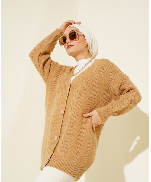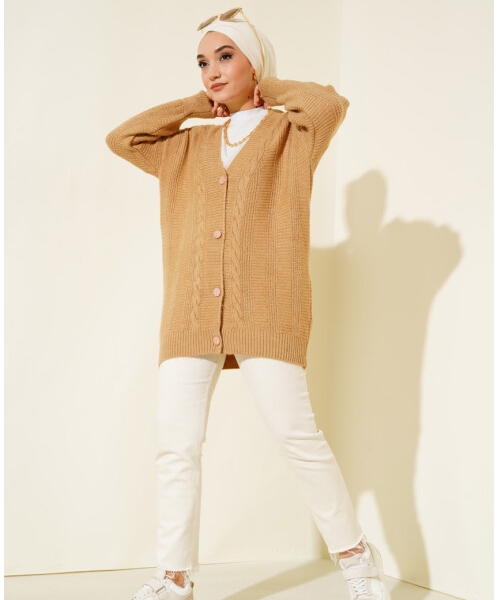 Длинный и теплый кардиган с элегантной вязкой косами и пуговицами спереди. Идеально подходит для холодного времени года, добавляет нотку стиля в повседневные и элегантно-повседневные наряды. Свободный крой и мягкая текстура делают его идеальным для многослойного ношения.