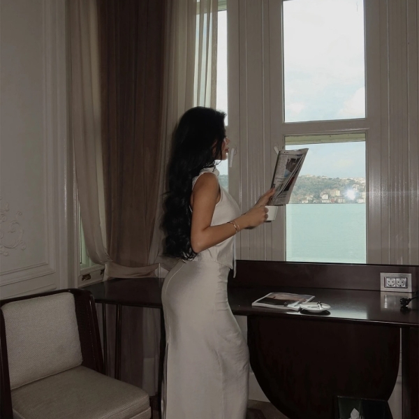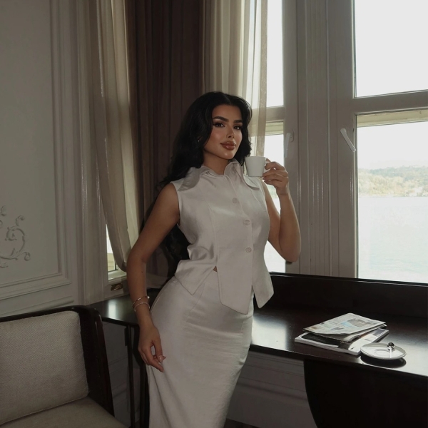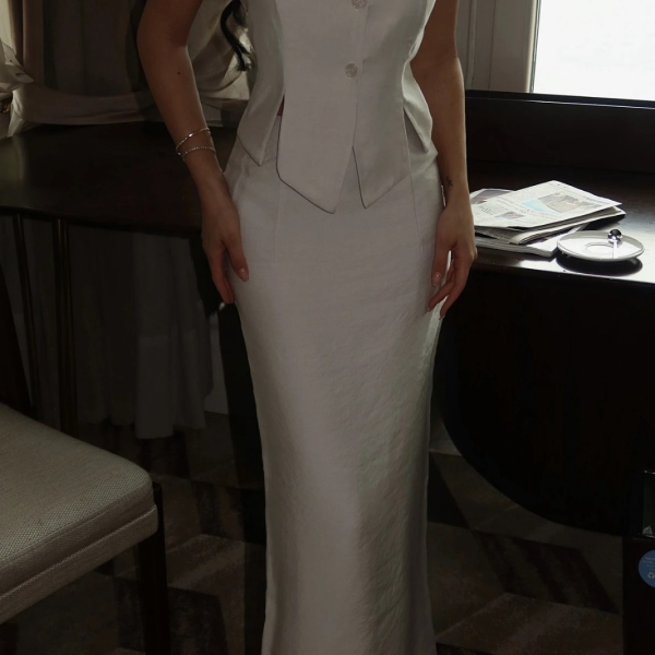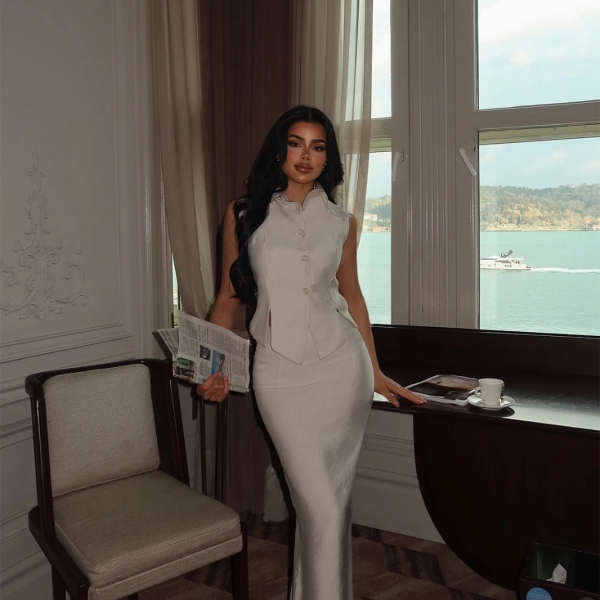 Un set sofisticat compus dintr-o vestă fără mâneci cu guler ridicat și nasturi în față, alături de o fustă lungă, conică, ce urmărește frumos linia corpului. Țesătura sidefată adaugă un efect rafinat și luminos, ideal pentru evenimente speciale, dar și pentru un look business elegant.