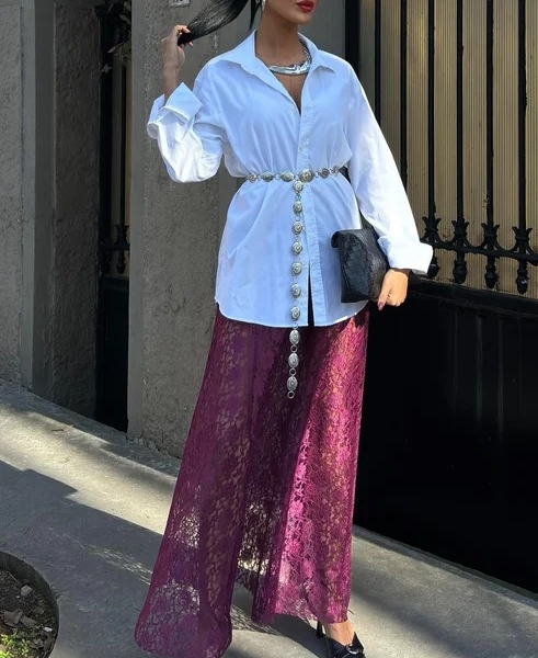 Лёгкая и изысканная макси-юбка из полупрозрачного кружева — отличный выбор для особых случаев и вечерних образов. Широкий крой придаёт воздушность, а эластичная ткань обеспечивает комфорт при носке. Легко сочетается с жакетами, элегантными топами или базовыми блузками.