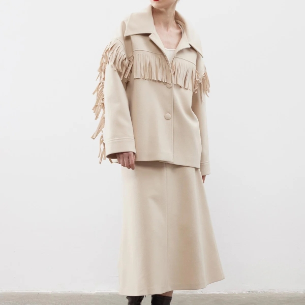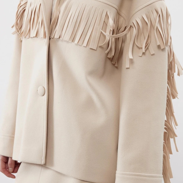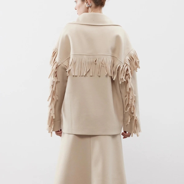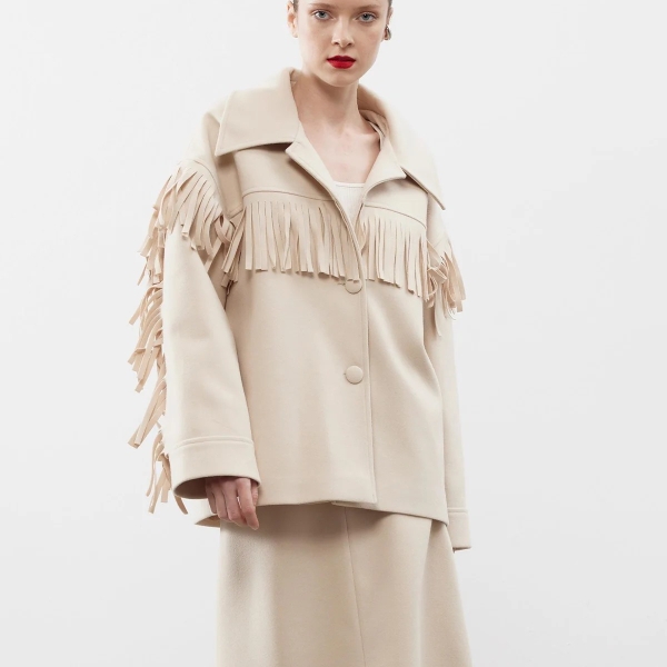 Добавьте элегантности в гардероб с этим кашемировым пальто, украшенным бахромой на груди и рукавах. Прямой крой и широкий воротник придают универсальность – идеально для повседневных и полуофициальных образов. Высококачественная ткань обеспечивает комфорт и стиль в прохладные дни. Подходит для ценителей минимализма и городского шика.