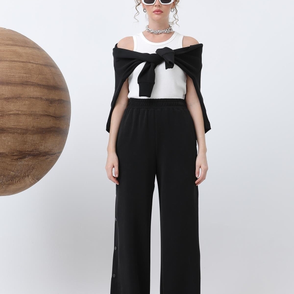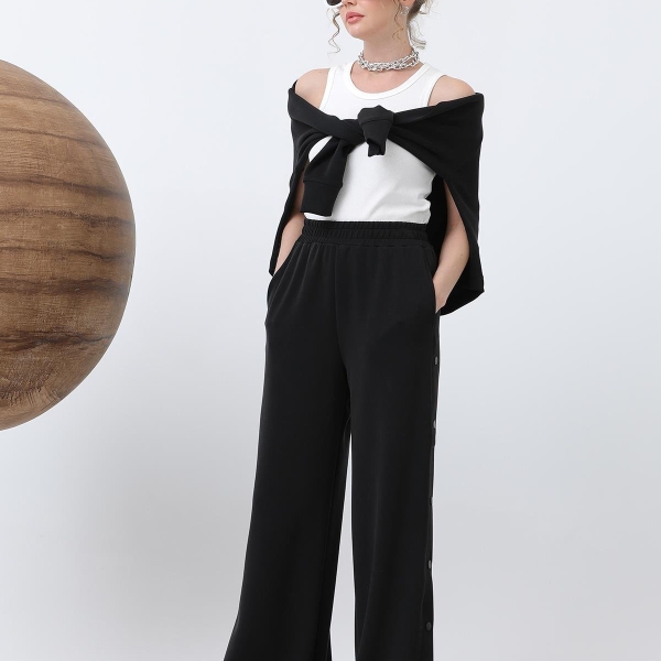 Pantaloni damă moderni, cu capse laterale decorative, confecționați dintr-un amestec confortabil de poliester, modal și spandex. Croiala largă și talia elastică oferă libertate de mișcare și un look urban relaxat. Designul cu capse adaugă o notă sport, perfectă pentru ținute casual de zi cu zi, plimbări sau momente de relaxare. Pantalonii cu capse laterale pot fi asortați cu topuri basic, hanorace sau bluze lejere pentru un outfit modern și practic. Alege o piesă versatilă care combină confortul cu un stil tineresc.