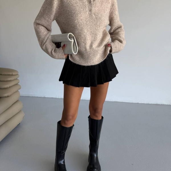 Pulover modern cu croială relaxată, ideal pentru ținute casual sau smart-casual. Designul cu guler tip polo și nasturi decorativi adaugă un aer rafinat, păstrând totodată confortul absolut. Textura moale și fină oferă o senzație plăcută la purtare, fiind alegerea perfectă pentru zilele răcoroase. Se asortează ușor cu fuste plisate, pantaloni sau blugi, creând un look echilibrat, feminin și actual.