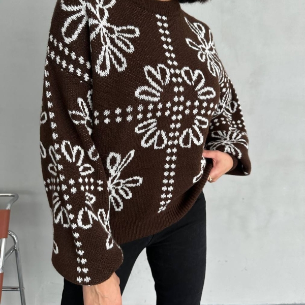 Вязаный свитер с белым узором снежинок — это уют и стиль в одном изделии. Свободный крой и объёмные рукава создают комфортную посадку, а праздничный дизайн идеально подойдёт для зимних образов и новогоднего сезона. Отличный выбор для повседневной носки или подарка.