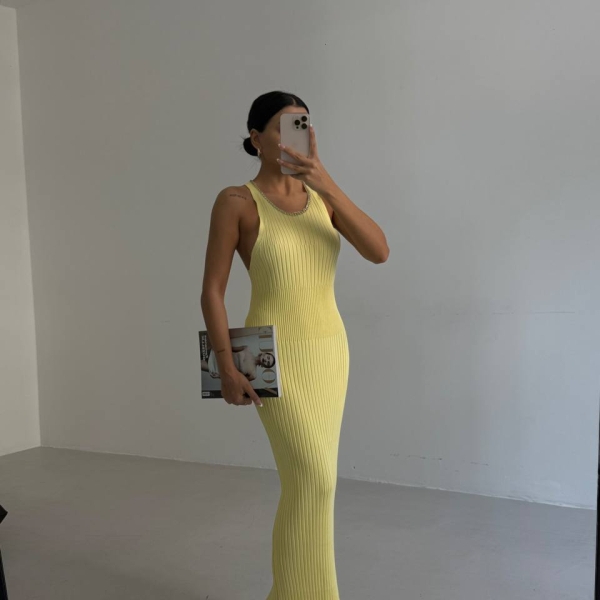 This fitted maxi dress features a racerback cut and ribbed vertical texture, enhancing the silhouette with elegance. The soft yellow tone brings a fresh, summery vibe. Ideal to pair with strappy sandals or casual sneakers.