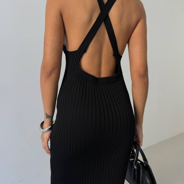 Această rochie lungă, mulată, cu croială tip racerback și textură ribată verticală, oferă un look modern și rafinat. Nuanța de negru adaugă un aer proaspăt și luminos, perfect pentru vară sau pentru evenimente casual-elegante. Materialul elastic se mulează pe corp, accentuând silueta fără efort. Se poate purta cu sandale minimaliste sau pantofi sport pentru un look urban.