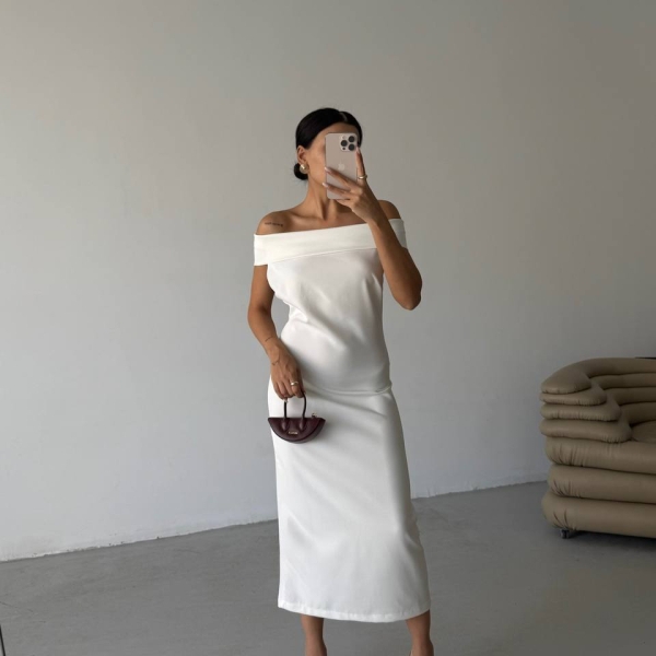 A striking off-shoulder midi dress perfect for special occasions and evening outings. The body-hugging silhouette enhances your curves, while the folded bust detail adds sophistication. The slightly stretchy fabric ensures both elegance and comfort.