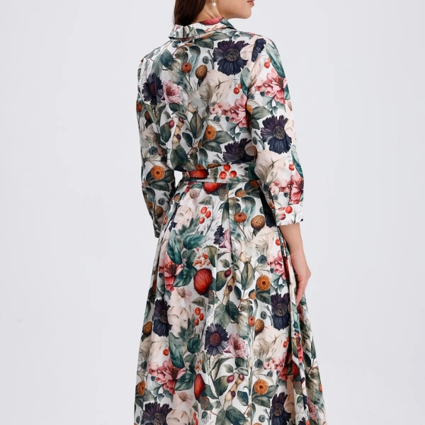 Элегантное платье миди из 100% хлопка с насыщенным цветочным принтом и поясом, подчёркивающим талию. Классический воротник, застёжка на пуговицы и рукава 3/4 придают образу элегантность и универсальность. Такое платье отлично подойдёт для особых случаев, прогулок или офиса, создавая женственный и свежий образ. Легко сочетается с сандалиями, балетками или туфлями на каблуке. Незаменимая модель для стильного и комфортного весенне-летнего гардероба.