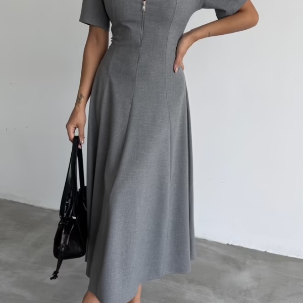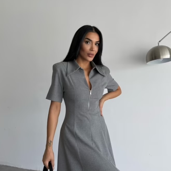 A timeless grey midi dress with a sharp classic collar, soft V-neckline, and fitted waist that flows into an A-line skirt. Elegant yet minimal, this piece transitions effortlessly from office settings to sophisticated city outings. A staple for polished, modern wardrobes.