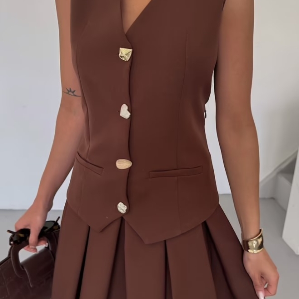 Redefine urban elegance with this sleeveless waistcoat-style dress in a sophisticated chocolate brown shade. Featuring a modern design and structured silhouette that flatters the body, this piece is the perfect choice for the confident woman who wants a bold yet refined look.