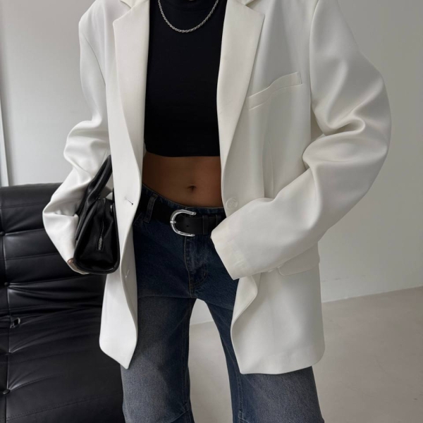 Elegant white blazer in an oversized cut with classic details. Features a double button front closure and flap pockets. A versatile piece to elevate both your office and casual outfits.