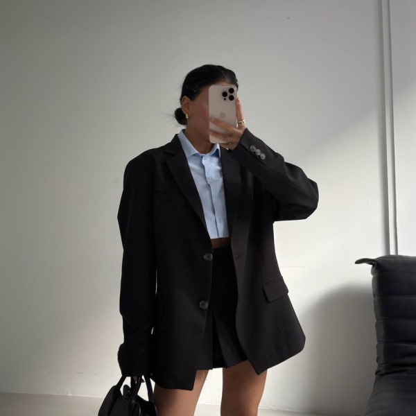Un sacou elegant negru, cu croială oversized și detalii clasice, perfect pentru un look sofisticat și contemporan. Se închide cu doi nasturi în față și are buzunare laterale cu clapetă. Ideal pentru a completa atât ținutele de birou, cât și cele casual chic.
