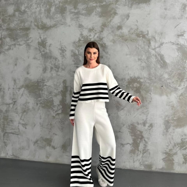 Двухпредметный комплект в полоску состоит из укороченного свитера с длинным рукавом и широких брюк. Идеально подойдёт для повседневного или уличного стиля. Полосы добавляют контраст и стиль, а мягкая трикотажная ткань обеспечивает комфорт на протяжении всего дня.