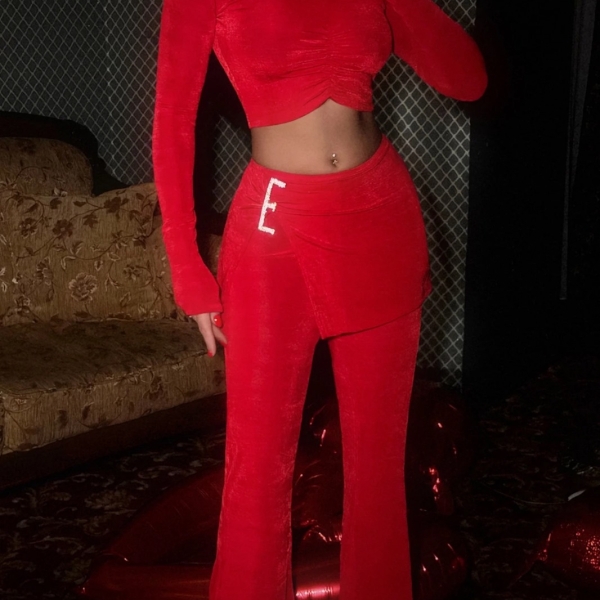 Set elegant din două piese, compus din bluză cu mânecă lungă și fronseuri în față și pantaloni evazați, completați de o fustă decorativă aplicată peste. Detaliile strălucitoare din talie adaugă un accent sofisticat. Realizat din material de catifea, cu textură catifelată și elasticitate confortabilă.