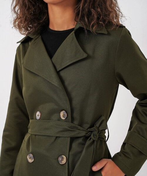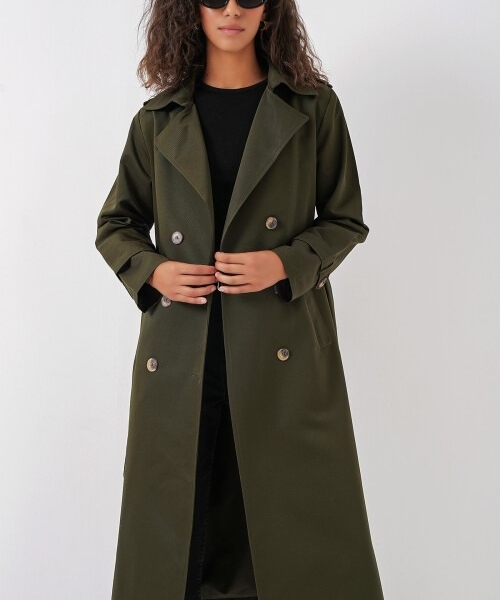 Timeless trench coat crafted from 100% polyester, designed for effortless style in-between seasons. Features a double-breasted button closure and a waist belt to enhance the silhouette. Its straight cut and versatile length make it suitable for both casual and business wear.