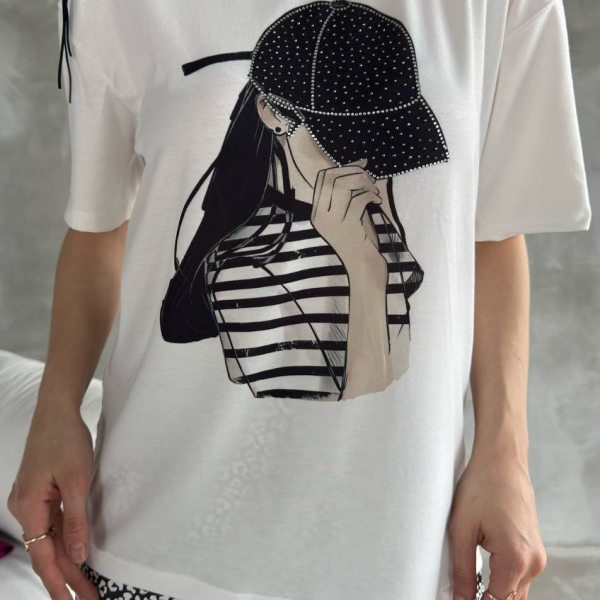 A trendy women’s white T-shirt featuring a graphic print of a girl in a cap and sequin embellishments for added flair. Made from soft, breathable fabric, this tee is perfect for casual or sporty outfits. Pairs effortlessly with jeans, skirts, or shorts for a standout everyday look.