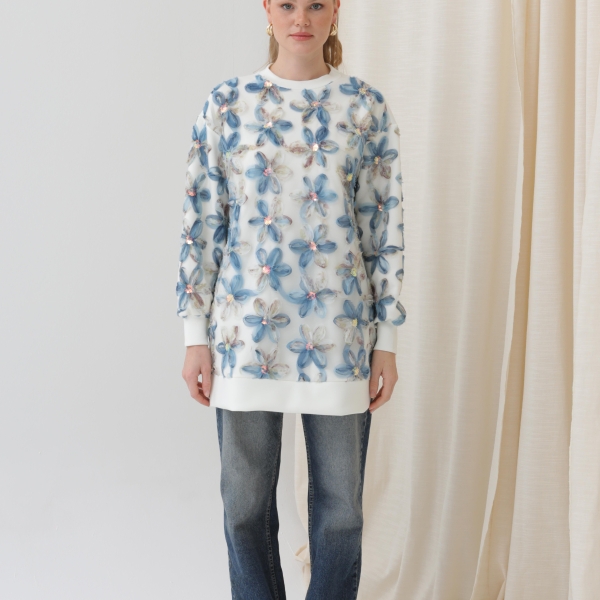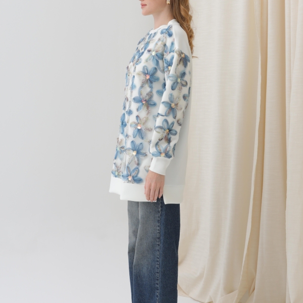 impresii despre Бело-синяя туника с 3D цветочным принтом