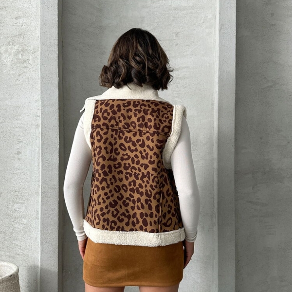 Стильный и тёплый жилет для прохладных дней. Леопардовый принт придаёт образу дерзость, а мягкий мех внутри обеспечивает комфорт. Косая молния и широкий воротник добавляют акцент. Отлично сочетается с водолазками и лонгсливами.